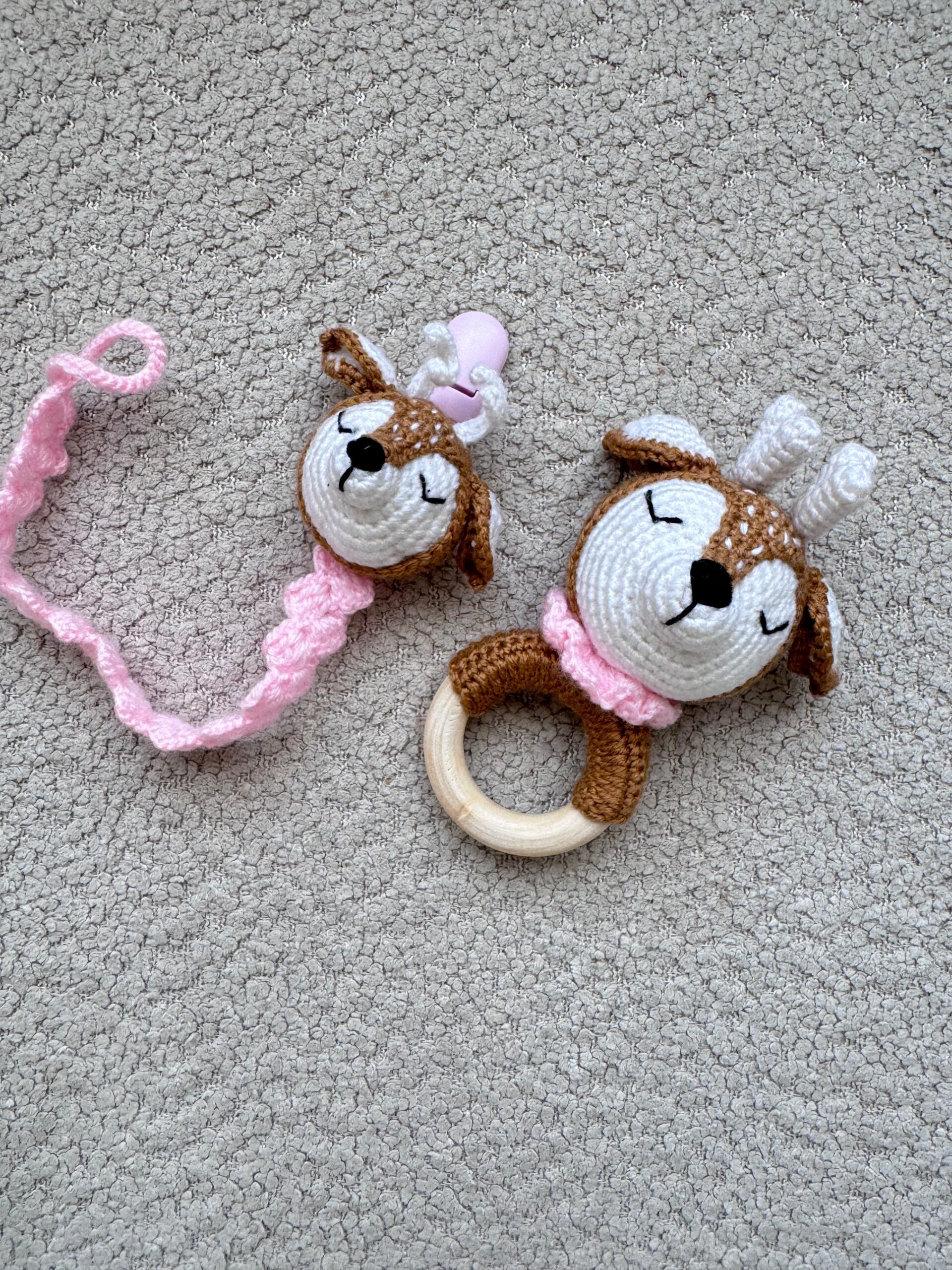Inspired by woodland charm, our handmade Bambi Rattle combines gentle play and teething relief in one adorable keepsake. Crafted with soft, baby-safe yarn and paired with a smooth, natural wooden teether, it soothes sore gums while keeping your baby happily engaged.