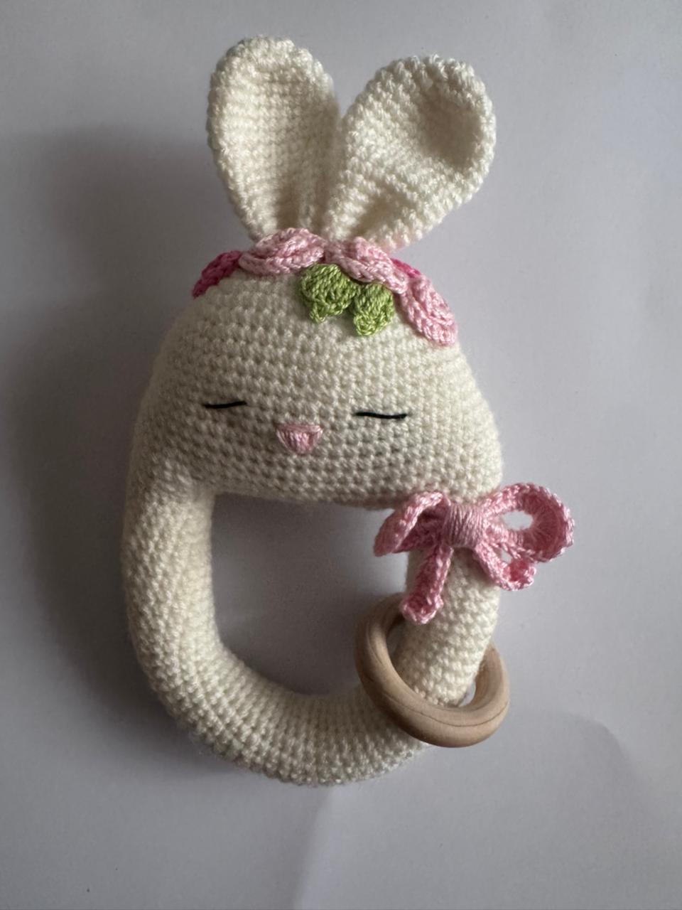 Crochet Floral Bunny Rattle with Mini Teether Ring